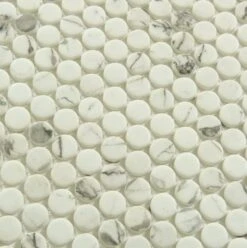 Elevate your space with the Carolina Dots Fashion Spec Grey Penny Round Tile. This exclusive tile features recycled matte glass, adding a touch of sophistication and sustainability to your design. Its unique penny round shape and subtle grey dots create a timeless yet modern look.