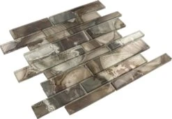 This random bricks brown glass tile replicates the old fashioned brick wall structure, creating an intriguing contrast between the classic ”stone” shape and a glass material. It shows one of the most popular trends on the market and encourages to develop and apply exceptional design ideas. While copying a brick structure only by shape and structure, it delivers a different taste to modern day areas. The extraordinary combination of materials in the bricks layout brings identity to this glossy random brick glass tile providing fantastic visual effects. It is a good choice for using in creative installations for both residential and industrial spaces.”