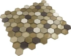 For the last few years tiles of hexagon form have become one of the key trends in tile design. An uncommon structure a bit like a honeycomb causes glass gold hexagon tile look fresh and originally, however this is not its only benefit. The hexagon design allows playing with combos of colors and using numerous tones in decor, while glossy hexagon mosaic is good choice for both big and small premises, as its fractional layout doesn