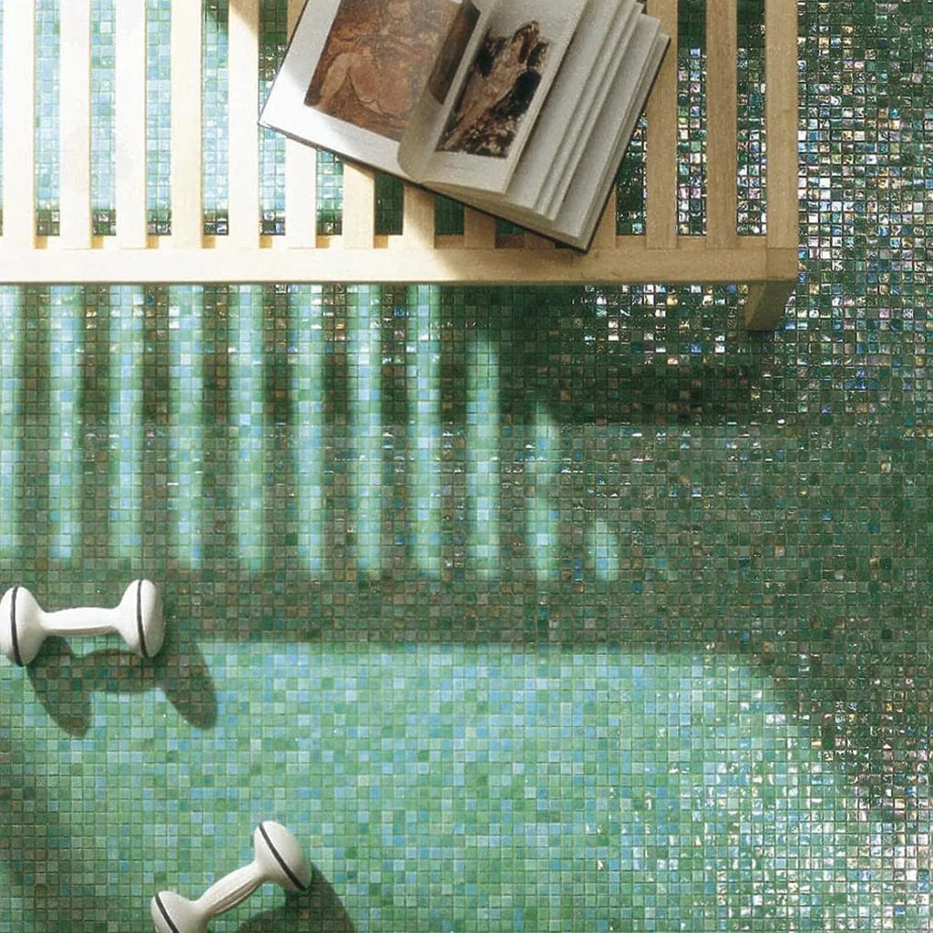 Smalto glass mosaic, both sides are finished, square chips with smooth and polished surfaces. Slightly round edges 4 mm nominal thickness. Fiber mesh mounted, well bonded, making it suitable for any wet conditions. Sheet size: 295×295 mm. Joint size: 1.63 mm.