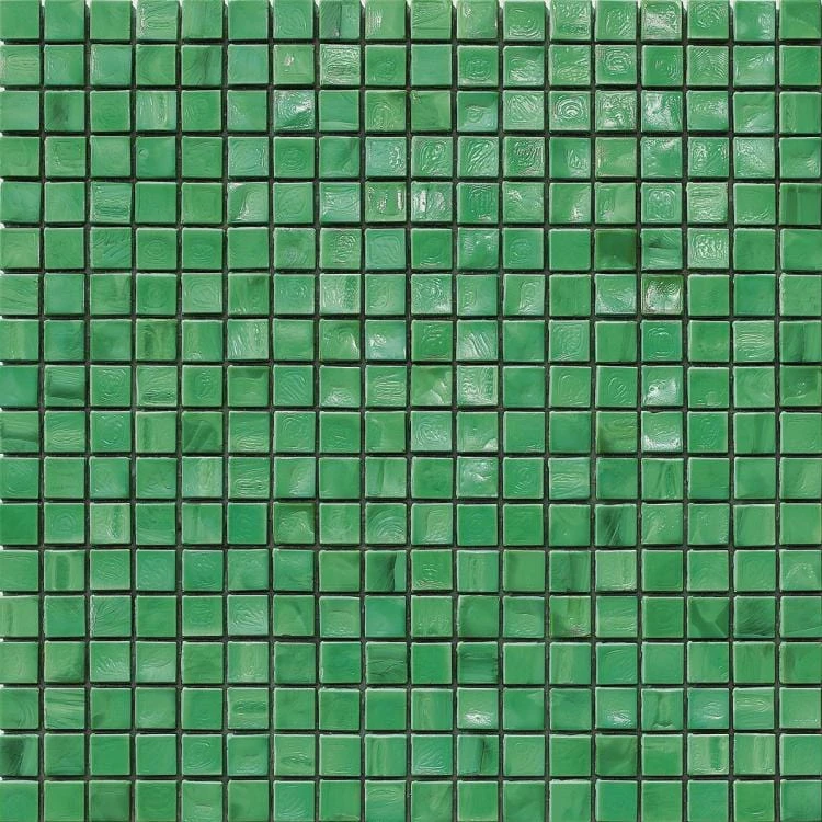 Smalto glass mosaic, both sides are finished, square chips with smooth and polished surfaces. Slightly round edges 4 mm nominal thickness. Fiber mesh mounted, well bonded, making it suitable for any wet conditions. Sheet size: 295×295 mm. Joint size: 1.63 mm.