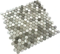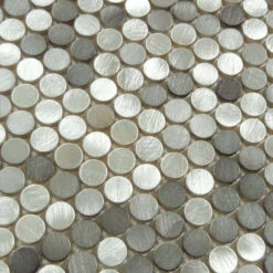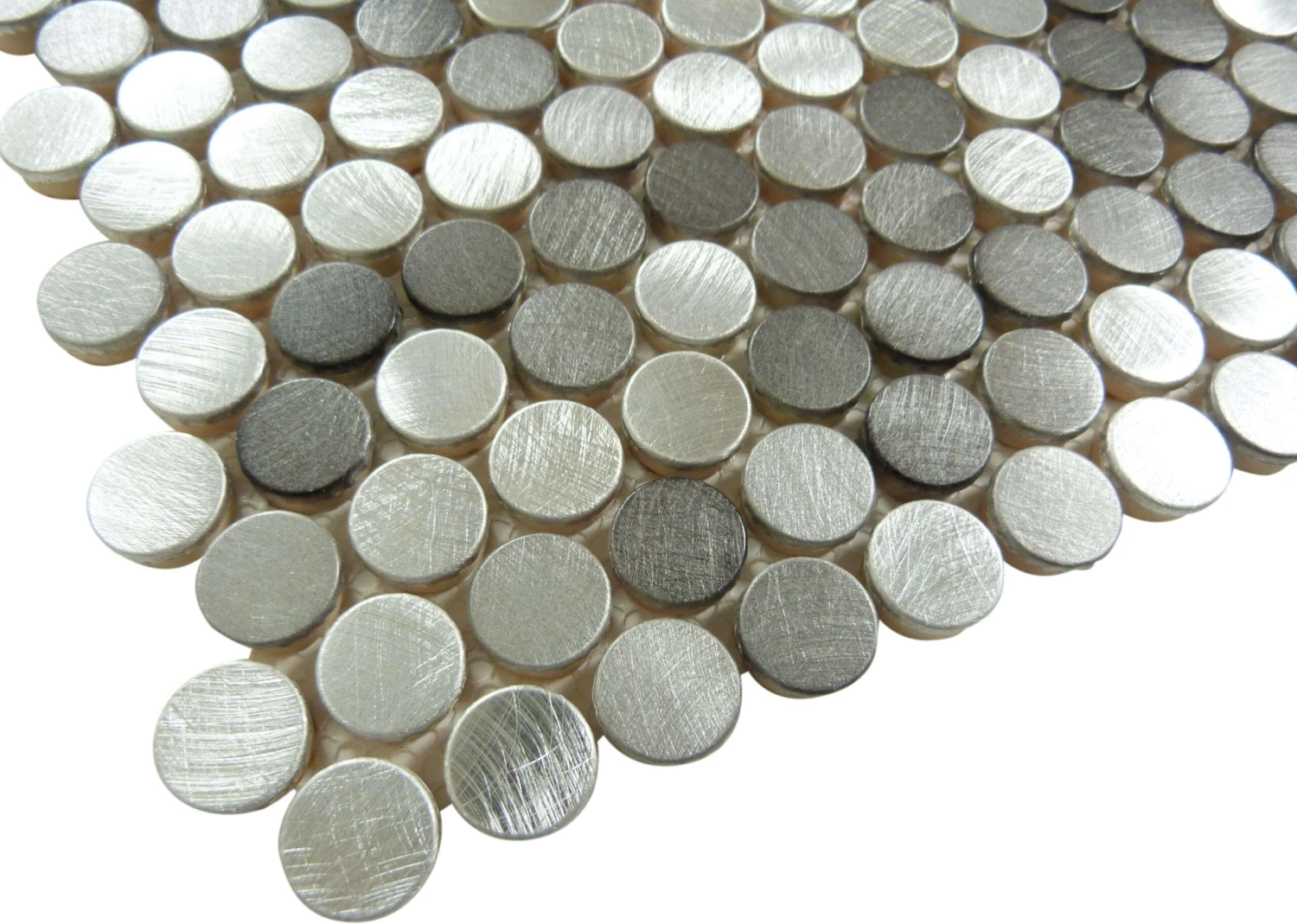 Experience the beauty of our Urban Jungle Grey Chameleon Penny Round Brushed Metal Tile. The unique brushed metal finish creates a stunning, eye-catching look. Transform your space and elevate your design with this versatile tile.